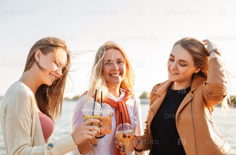 Молодые подруги вместе гуляют по улице