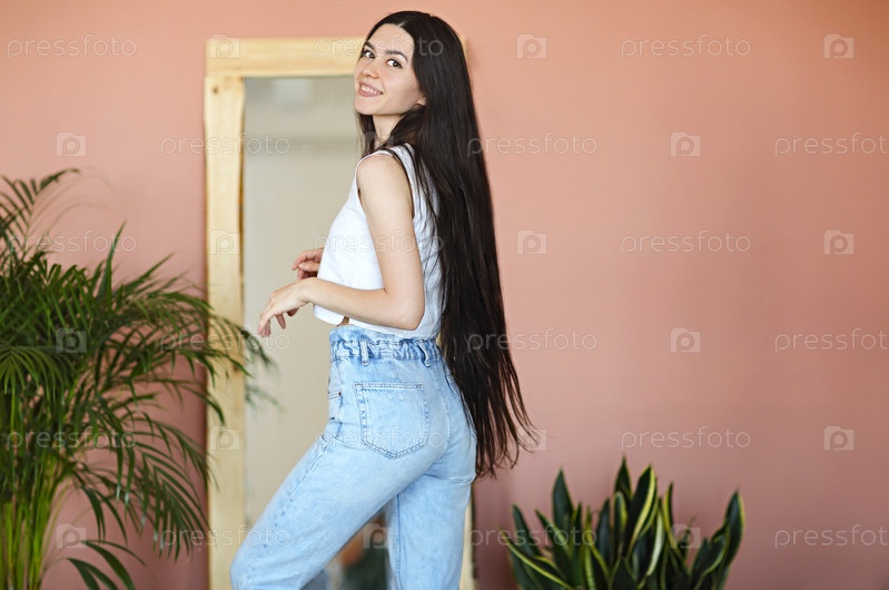Стильная молодая женщина возле зеркала и растений