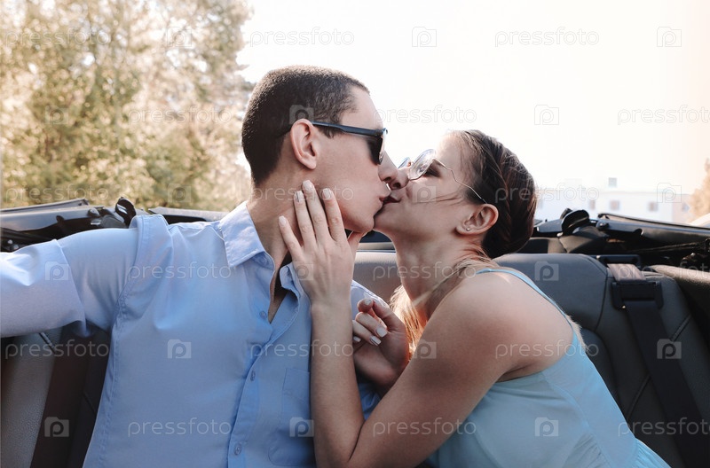 Романтическая пара с гитарой отдыхает возле машины