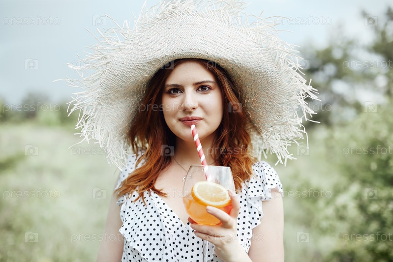 Молодая женщина в шляпе с цитрусовым коктейлем