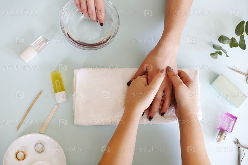 Женщина получает процедуру маникюра в салоне