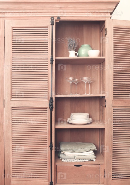 Кухонный шкаф с посудой, такой как тарелки, скатерти и стаканы