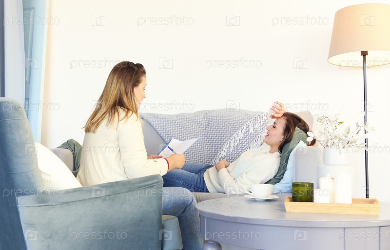 Улыбающаяся женщина на диване разговаривает с терапевтом