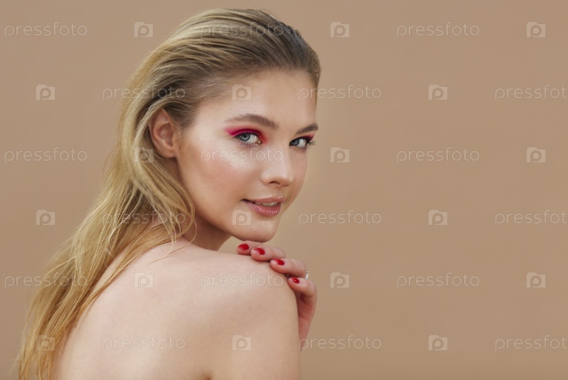 Красивая модельная девушка с красным маникюром на ногтях с ярким макияжем и косметикой