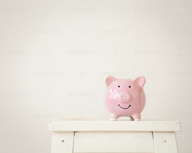 Розовая свинья копилка на белом фоне