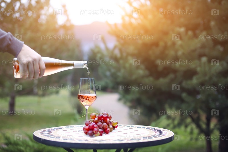 Мужчина наливает розовое вино в бокал в осеннем винограднике на мраморном столе