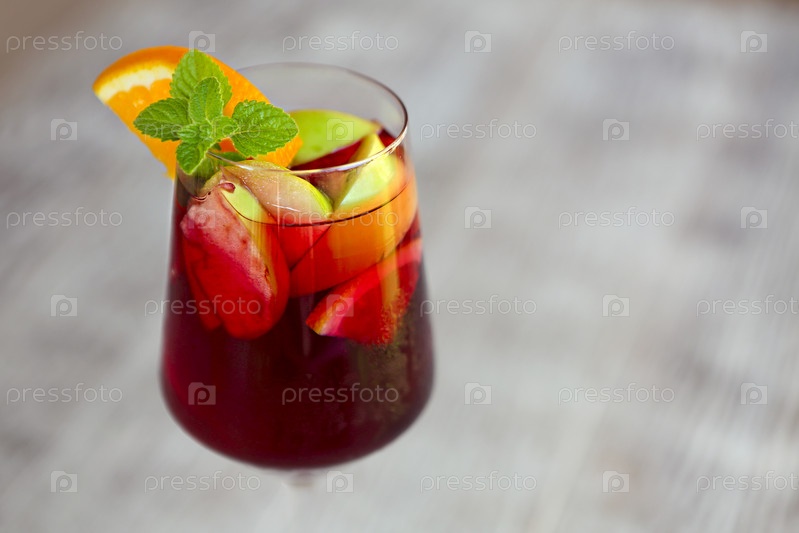 Стакан ледяной сангрии с клубникой, апельсином, яблоком и лимоном на столе
