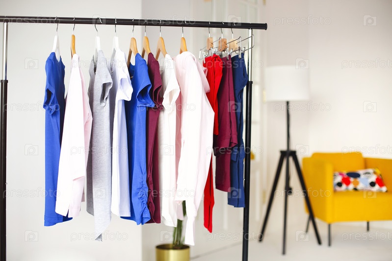 Красочная одежда висит на вешалке в комнате