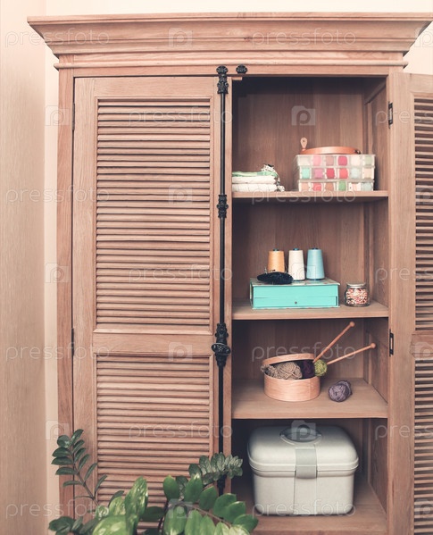Швейные принадлежности в ретро деревянном шкафу