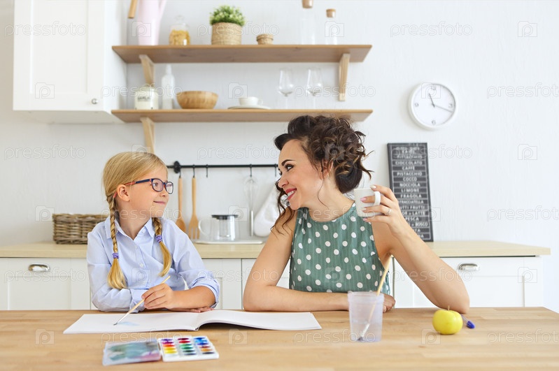 Мать и дочь вместе рисуют дома на кухне