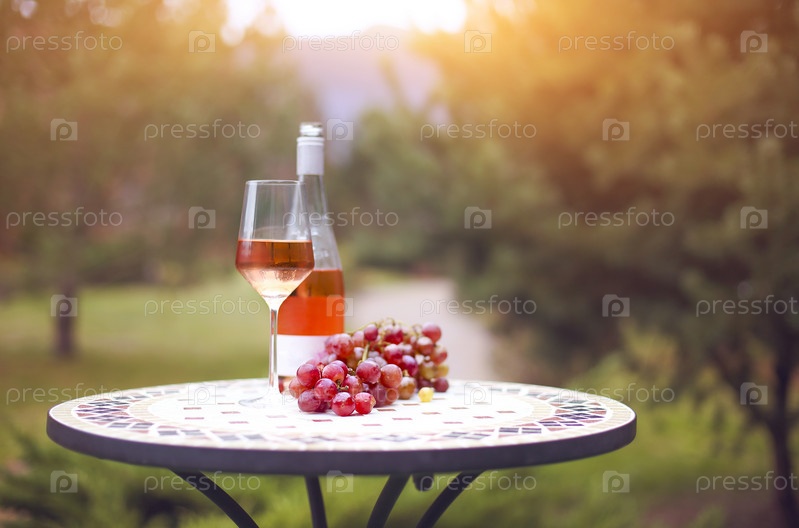 Один стакан и бутылка розового вина в осеннем винограднике на мраморном столе