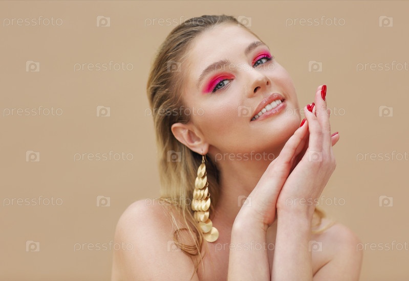 Красивая модельная девушка с красным маникюром на ногтях. Модный яркий макияж и косметика