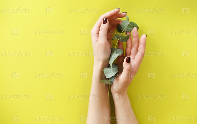 Обрезать анонимную самку, держащую свежее зеленое растение на желтом фоне