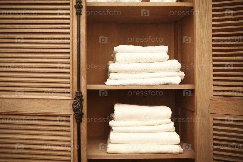 Стопки чистых белых мягких полотенец в шкафу в комнате