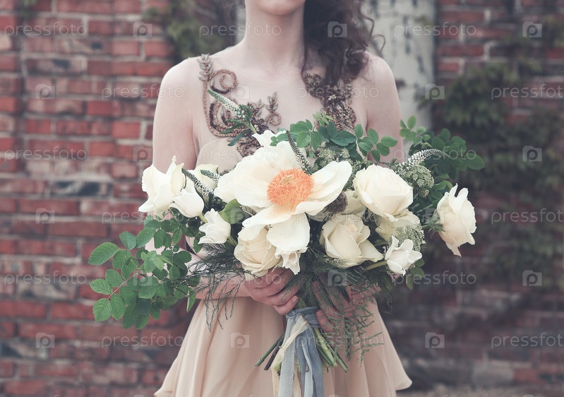 Женщина в платье бохо с пышным букетом