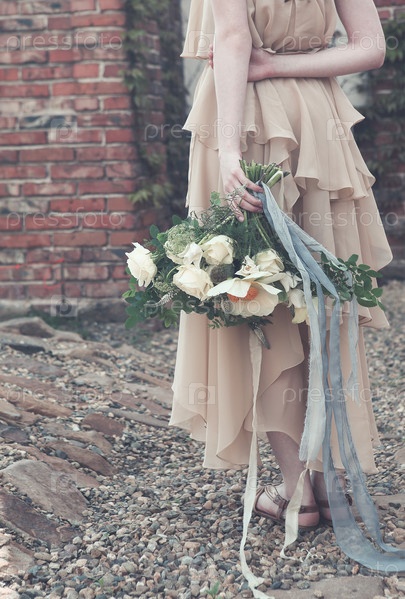 Женщина в платье бохо с пышным букетом