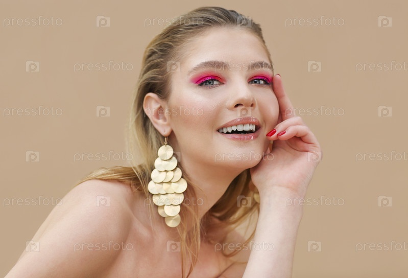 Красивая модельная девушка с красным маникюром на ногтях. Модный яркий макияж и косметика