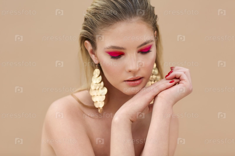Красивая модельная девушка с красным маникюром на ногтях. Модный яркий макияж и косметика
