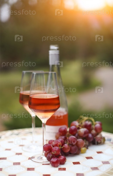 Два бокала и бутылка розового вина в осеннем винограднике на мраморном столе
