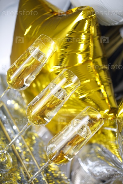 Крупный план блестящих бокалов шампанского на фоне золотых и серебряных шаров