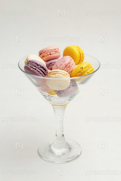 Мини красочные французские макароны в бокале мартини на белом фоне. Праздничная эстетика
