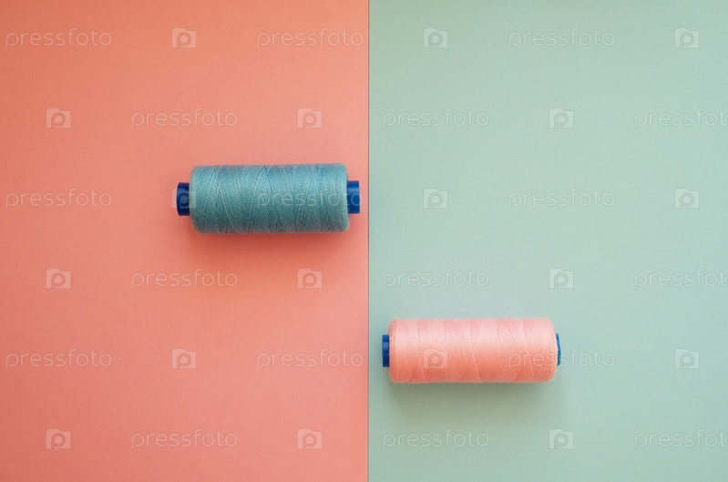Розовые и синие швейные бобины на геометрическом двухцветном фоне. Концепция текстиля или рукоделия