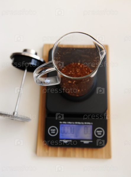 Френч-пресс с молотым кофе. На электронных весах с таймером. Вид сверху. белый фон