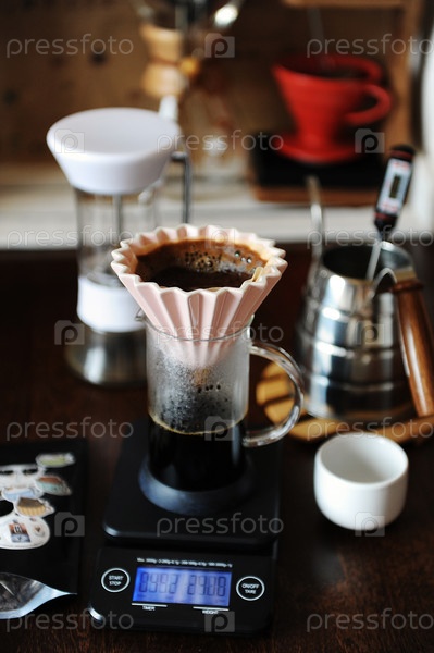Альтернатива ручному завариванию кофе в розовой керамической капельнице оригами с бумажным фильтром. Гриндер. Чайник на гусиной шее. Электронные весы