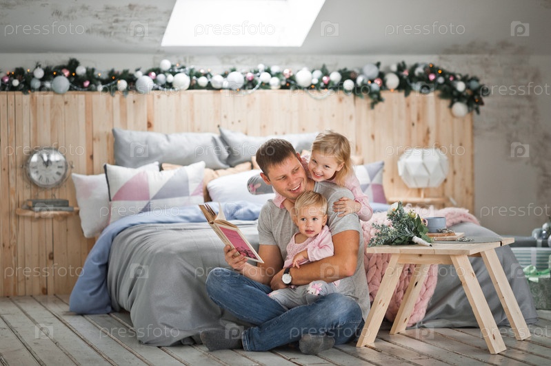 Молодая семья отдыхает дома во время новогодних праздников