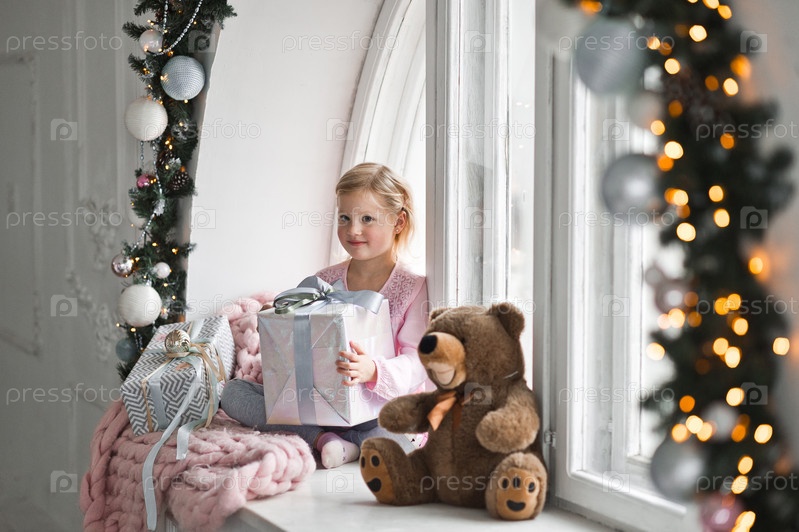 Новогоднее украшение комнаты и ребенок с подарком