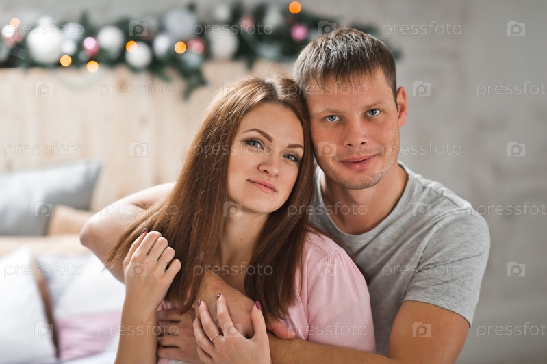 Молодожены нежно обнимаются на фоне елки