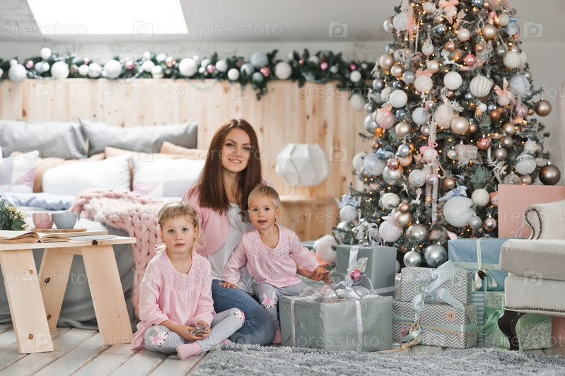Мать и дети в ожидании подарков сидят возле рождественской елки