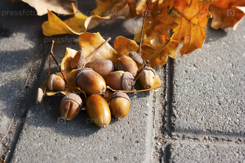 Желуди лежат на дубовых листьях