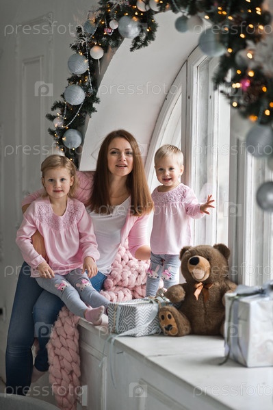 Мать с двумя маленькими дочерьми сидит на подоконнике Раунд, декор