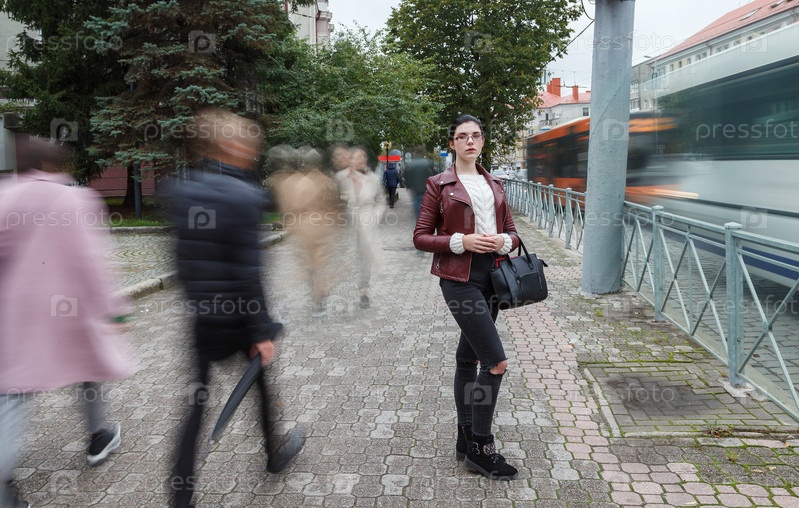 Одинокая девушка в коричневой куртке и черных джинсах стоит на тротуаре