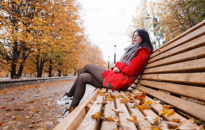 Молодая девушка в красном пальто сидит на скамейке в городском парке