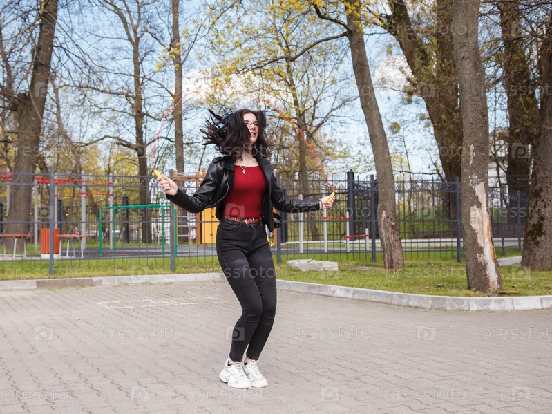 Молодая брюнетка в черной куртке и джинсах прыгает через скакалку на открытом воздухе в солнечный весенний день