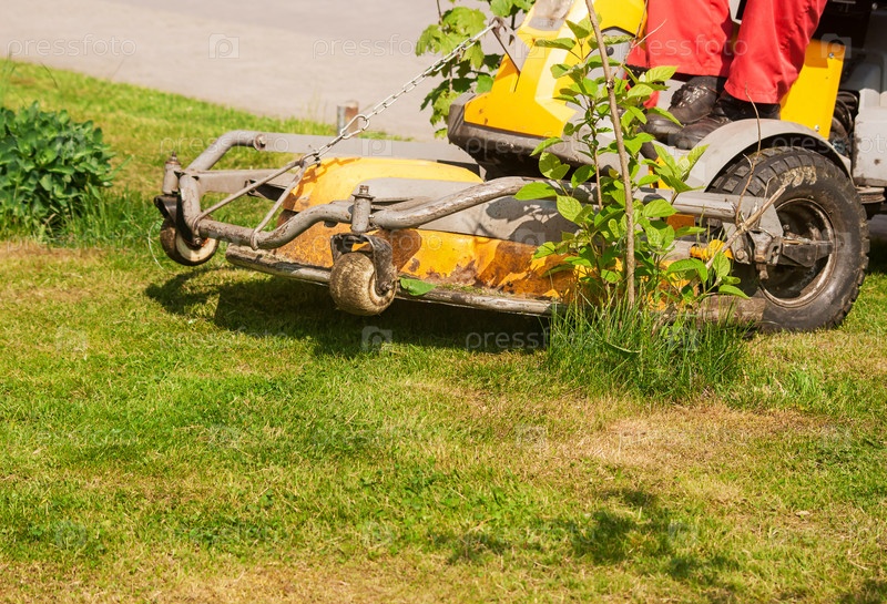 Мужчина косит газонокосилку