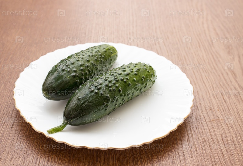 Два зеленых огурца лежат на белой тарелке на деревянном столе. закрытый крупным планом