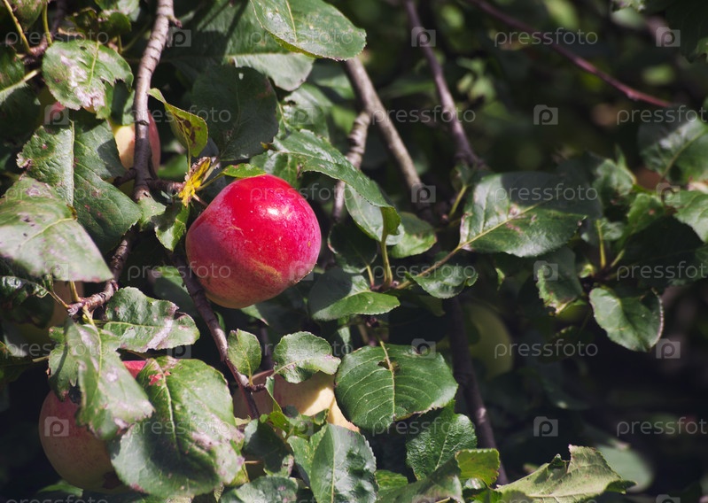 Ярко-красное яблоко на ветке