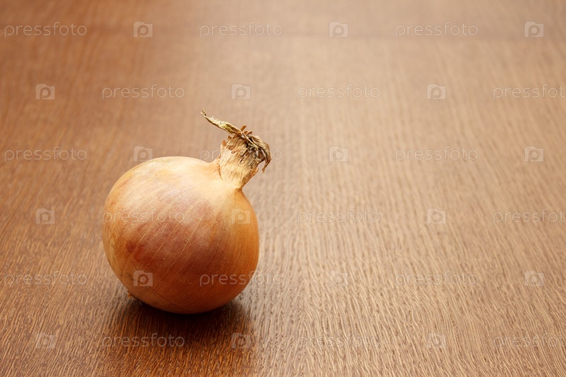 Большой коричневый лук, лежащий на деревянном столе. закрытый крупным планом