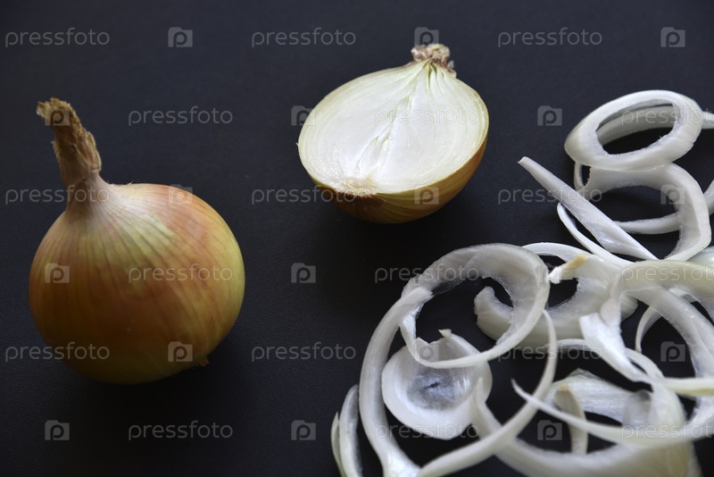 Белая тарелка с нарезанным луком и луком на черном фоне. Вкусный лук крупным планом