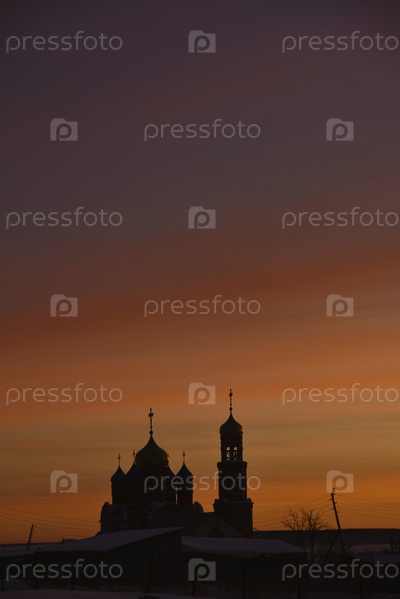 Христианская церковь на фоне красного заката