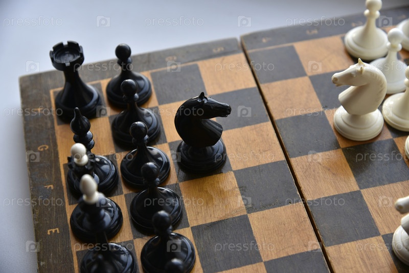 Старая шахматная доска с белыми и черными фигурами