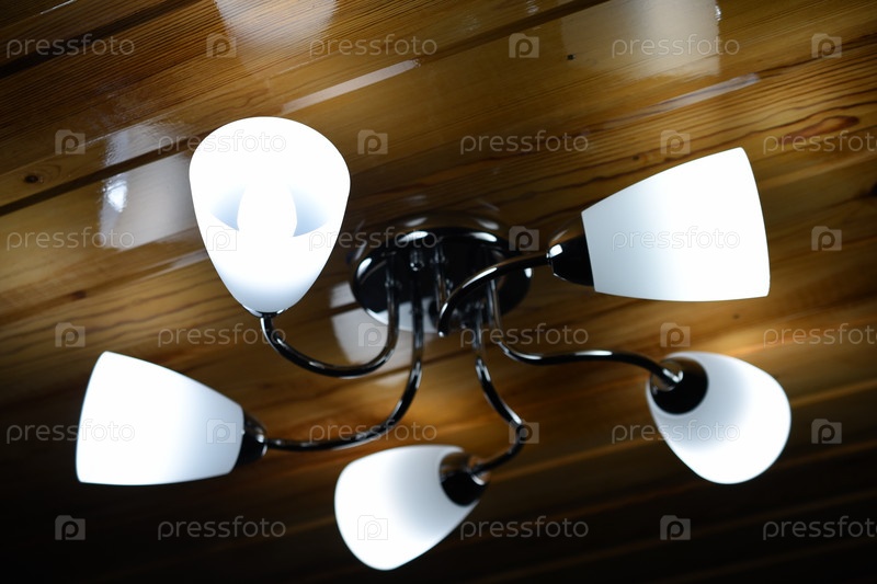 Люстра на деревянном потолке с горящими лампами