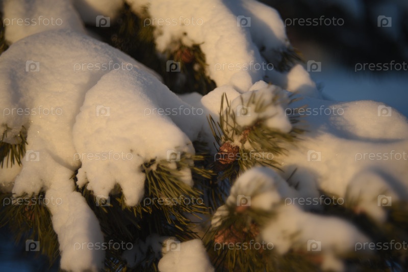 Сосновые ветки и деревья в снегу зимой