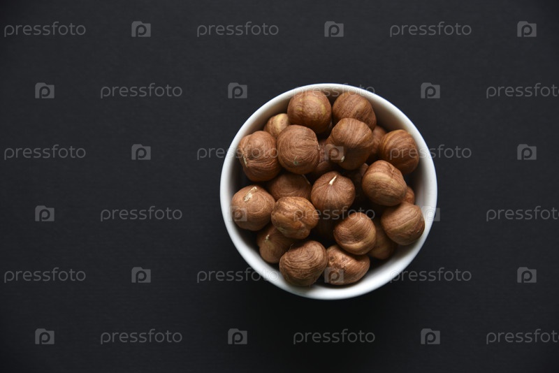 Вкусные фундуки в керамической миске на черном фоне. Вкусный завтрак из орехов