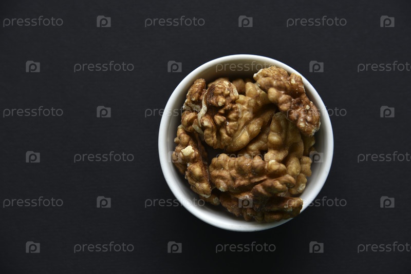 Вкусные грецкие орехи в керамической миске на черном фоне.Вкусный завтрак из орехов Juglans regia