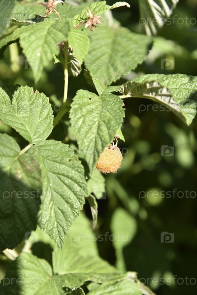 Желтая большая малина на зеленом кусте. Вкусная редкая желтая малина в летнем саду