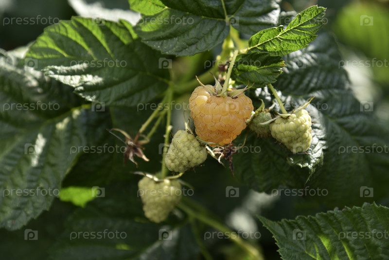 Желтая большая малина на зеленом кусте. Вкусная редкая желтая малина в летнем саду